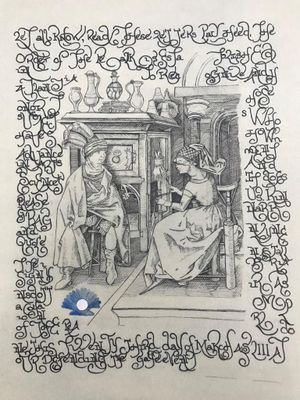 54728451 1979091928867607 4081062342517850112 o.jpg|Pearl Scroll for Signy Biarnardottir, Exemplar: Woman Spinning and Visitor by Israhel van Meckenem the Younger (Germany, Mechenem, circa 1440/1445-1503). Text based on hand in Mira calligraphiae monumenta (The Model Book of Calligraphy) 1561-1596
