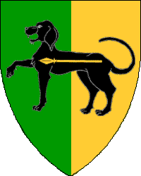 Per pale vert and Or, on a talbot passant sable a spear fesswise Or.