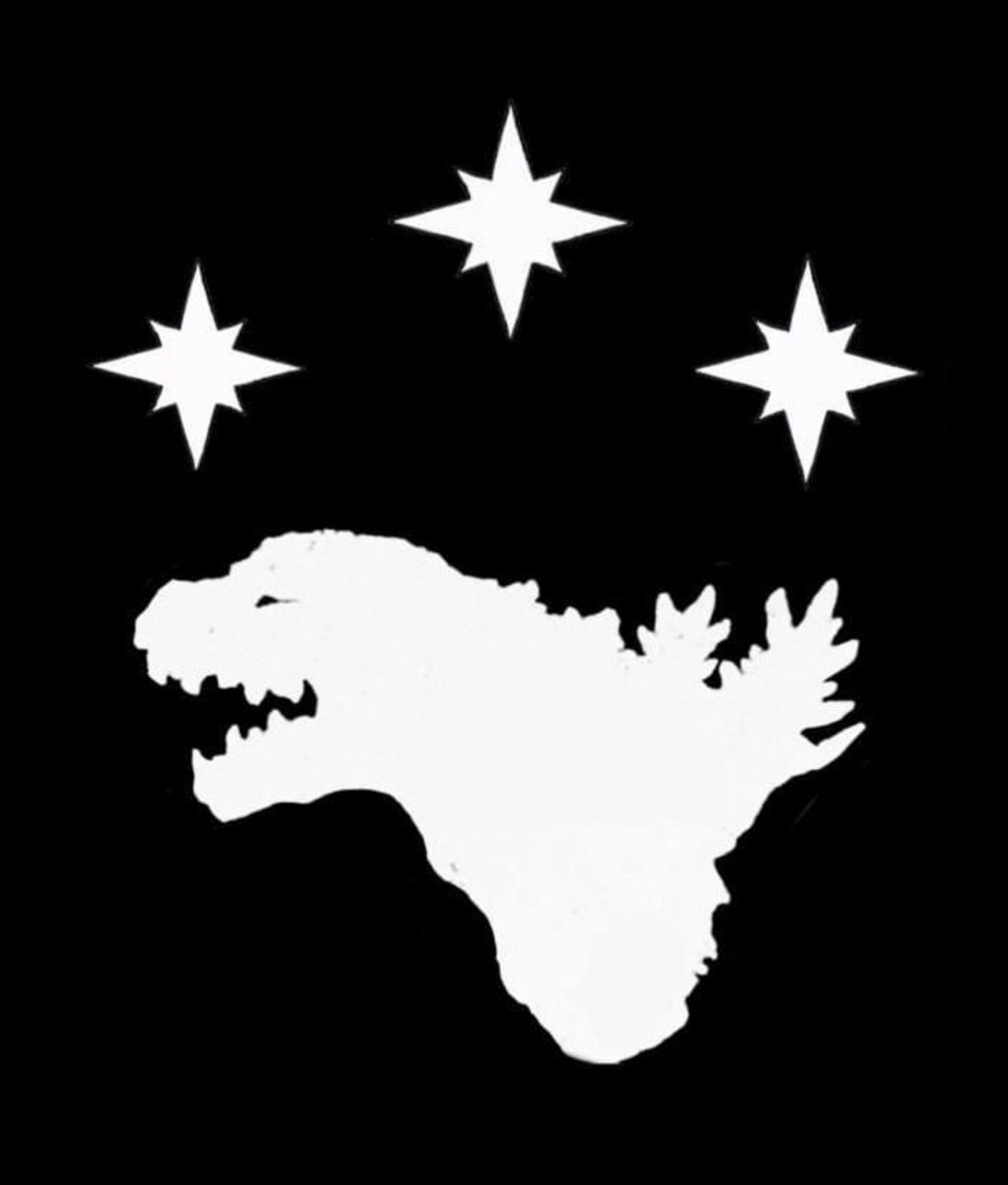 Black background, 3 compass stars in white in an arch over a dragon's head in white that is in the same shape as Godzilla