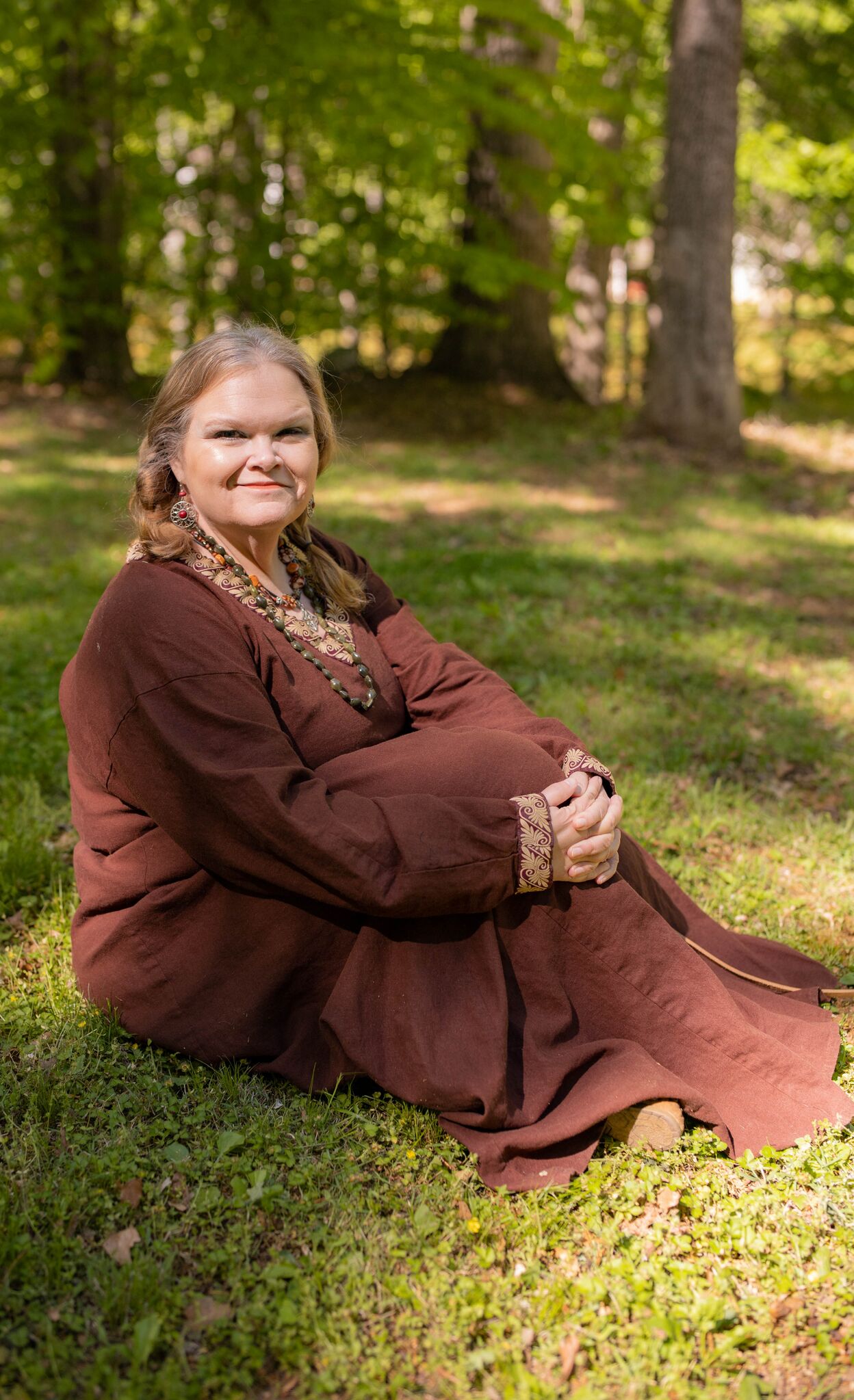 Jenefer de Winter sitting in the woods in a brown dress.