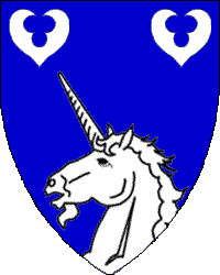 Azure, a unicorn's head issuant from base and in chief two seeblätter argent