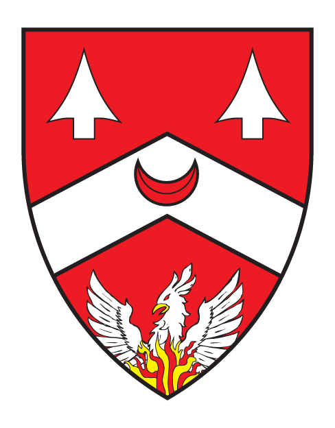 ![]() Gules, on a chevron between two spearheads and issuant from base a phoenix argent flammant proper a crescent gules. |